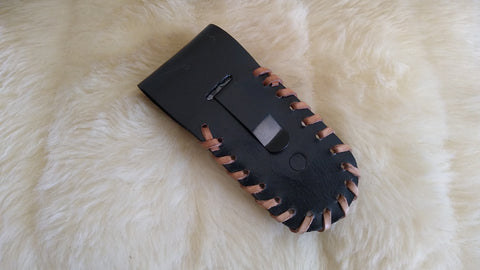 INCLUDES A HANDMADE AND SEWN LEATHER, BASKET WEAVE SHEATH WITH BELT CLIP