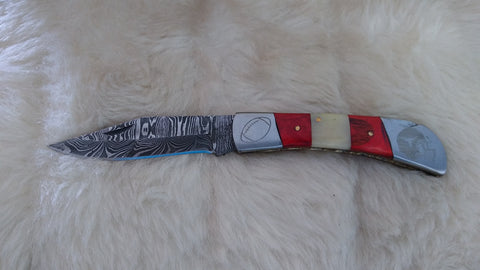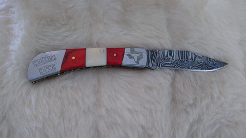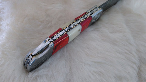 BEAUTIFULLY CRAFTED, HAND MADE DAMASCUS STEEL (BACK LOCK W/THUMB PUSH CLOSURE, AND HAND MADE STAINLESS BOLSTERS). FEATURES STUNNING FILE WORK ON SPINE OF HANDLE.