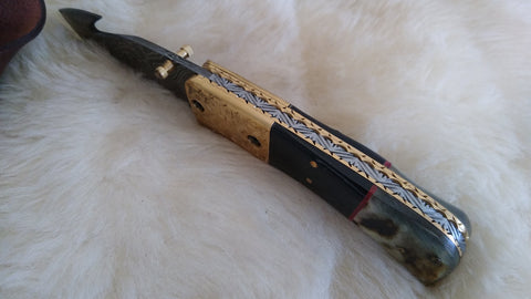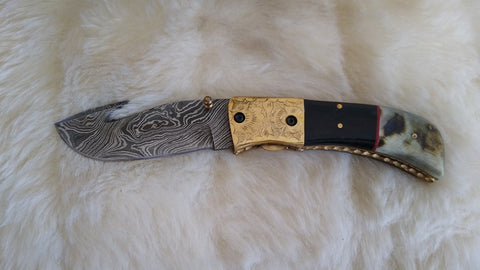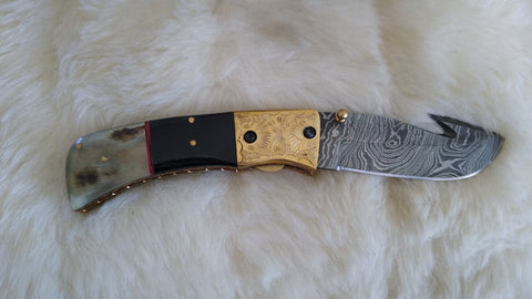 BEAUTIFULLY CRAFTED, HAND MADE DAMASCUS STEEL, EXCELLENT QUALITY RAZOR SHARP FOLDING BLADE, LINER LOCK LOCKING MECHANISM, DUAL THUMB NOTCHES, THUMB SLIDE RELEASE, SUPER SHARP GUT HOOK, WITH EXQUISITE WORKMANSHIP AND EXTREME DURABILITY. THIS KNIFE HAS A VERY COMFORTABLE FIT IN HAND.