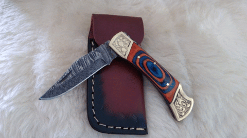 BLADE: 3" HAND FORGED DAMASCUS STEEL. THIS STUNNING BLADE IS THE RESULT OF HOURS OF FORGING. BLADE HAS BEAUTIFUL HAND GRINDS AND A NAIL NICK FOR EASE OF OPENING AND CLOSING. THE MAKER HAND FORGED THE BLADE OF THIS KNIFE WITH 1095 AND 15N20. THE BLADE WAS GIVEN EXCELLENT HEAT TREATMENT AND ROCKWELL HARDNESS 58-60 HRC.