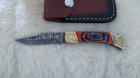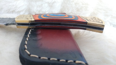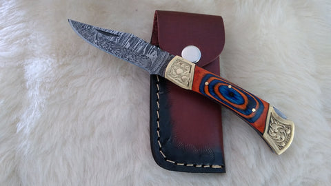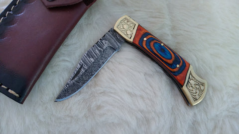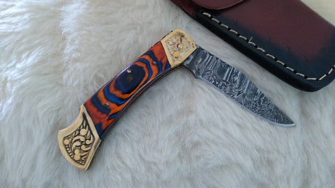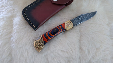 BEAUTIFULLY CRAFTED, HAND MADE DAMASCUS STEEL FOLDING (BACK-LOCK), HAND MADE ENGRAVED BOLSTERS, WITH STUNNING AUBURN COLORS, HARD WOOD HANDLE.